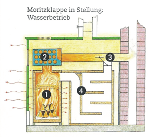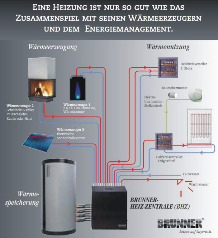 Die WassertechnikDer Energiebedarf im Neubau sinkt stetig. Um den Aufstellraum des Ofens nicht zu überhitzen, versucht man die überschüssige Energie in warmes Wasser um zu wandeln. Hierzu benötigt man ein geeignetes Heizgerät und einen Pufferspeicher. Vom Pufferspeicher wird dann das warme Wasser über Pumpen an Heizkörper oder Flächenheizungen in anderen Räumen gebracht.